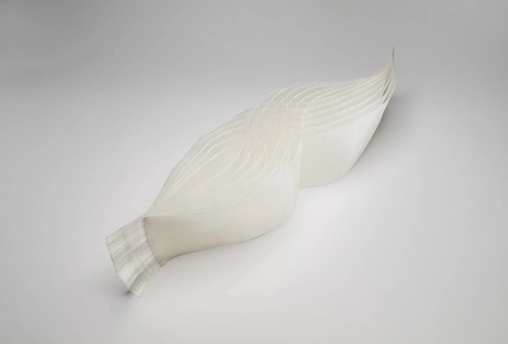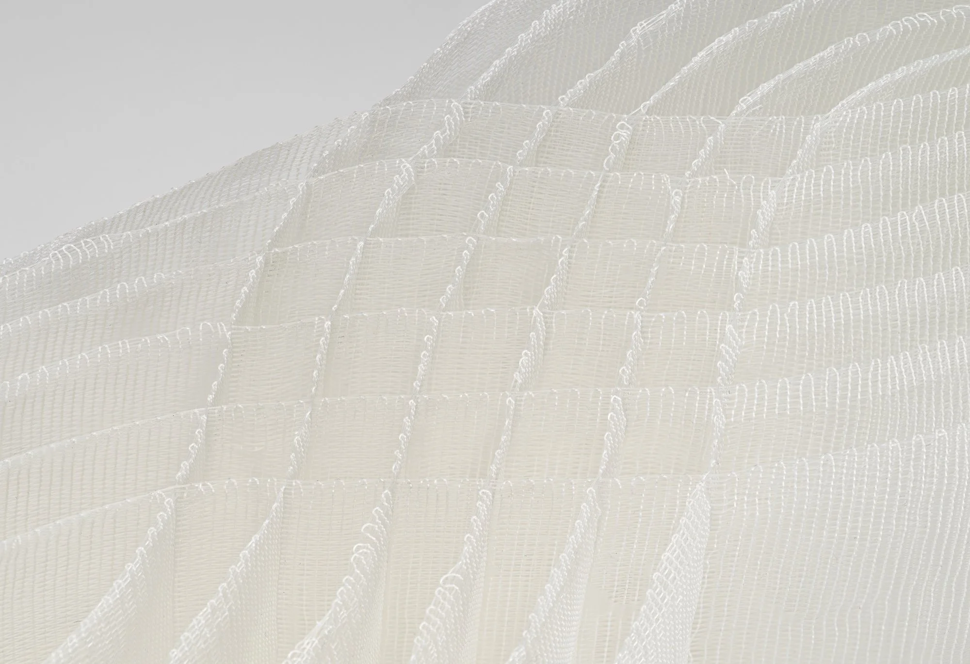 Vestige is a handwoven textile sculpture that reads as a fragment or artefact rather than a closed object. Woven entirely on the loom from a single continuous cloth, the work separates into twelve layered passages that intersect, diverge, and reconnect before resolving into a unified three-dimensional structure.