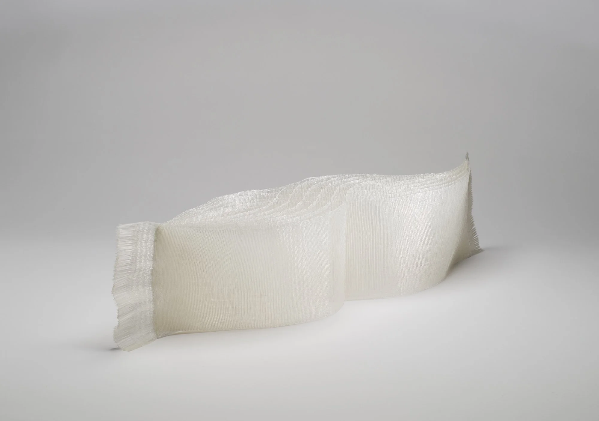 Resting on a surface, the sculpture invites movement around it as overlapping layers create shifting transparency, depth, and interior views that change with light and perspective. Constructed without armature or post-loom fabrication, Vestige emerges through sustained, labor-intensive weaving, reflecting a quiet balance between fragmentation and cohesion, presence and transformation.