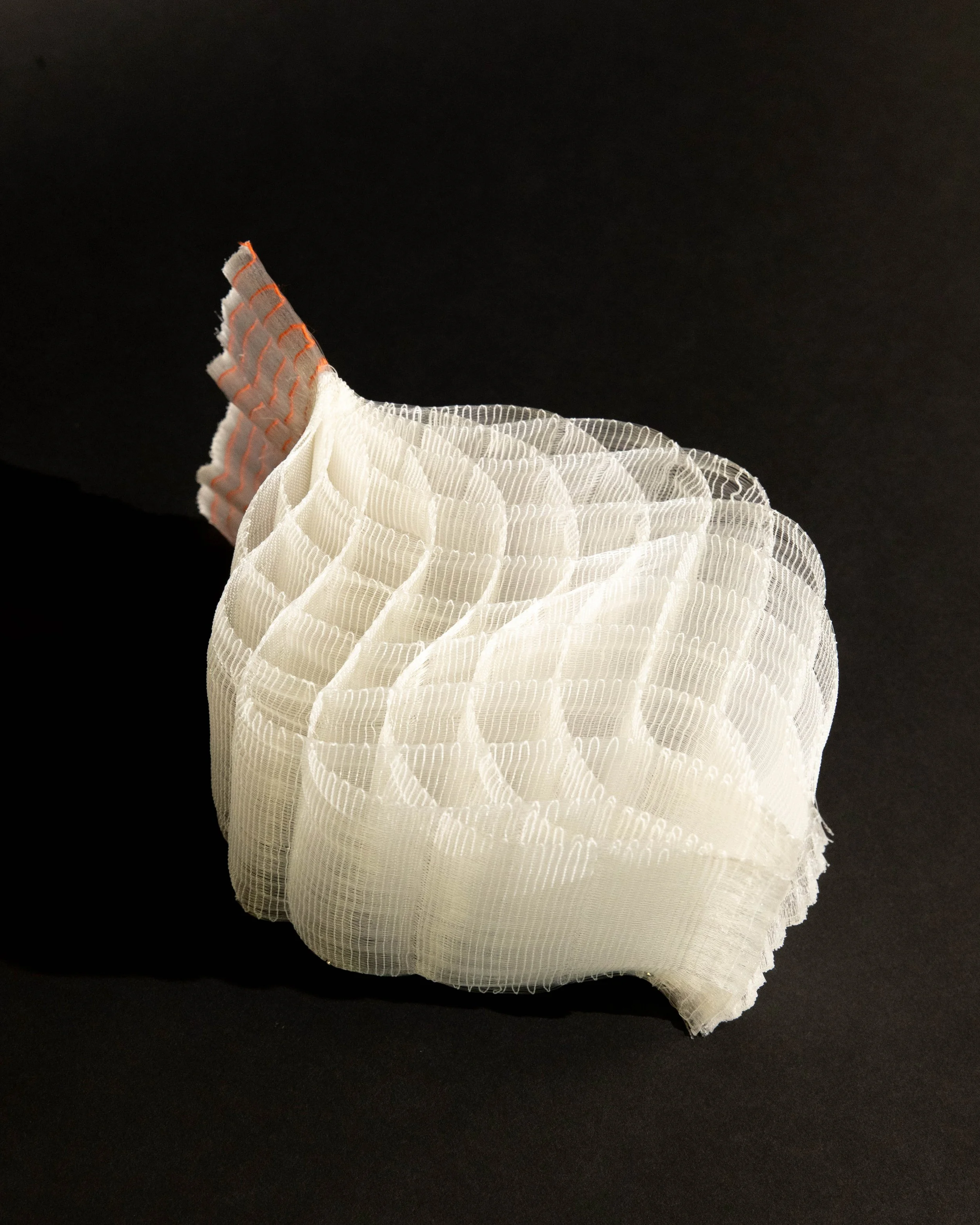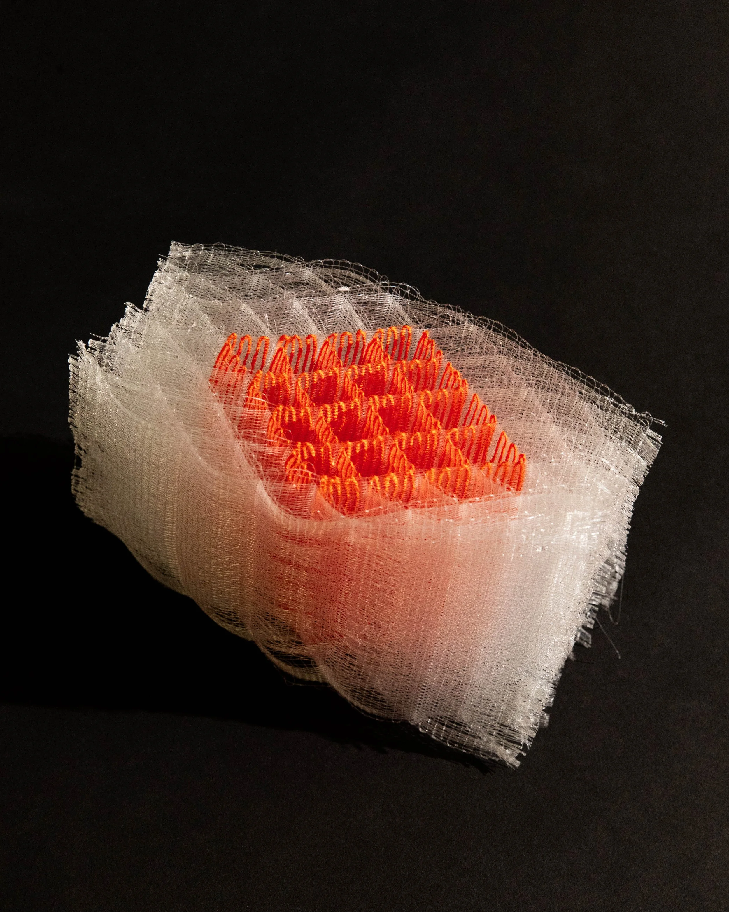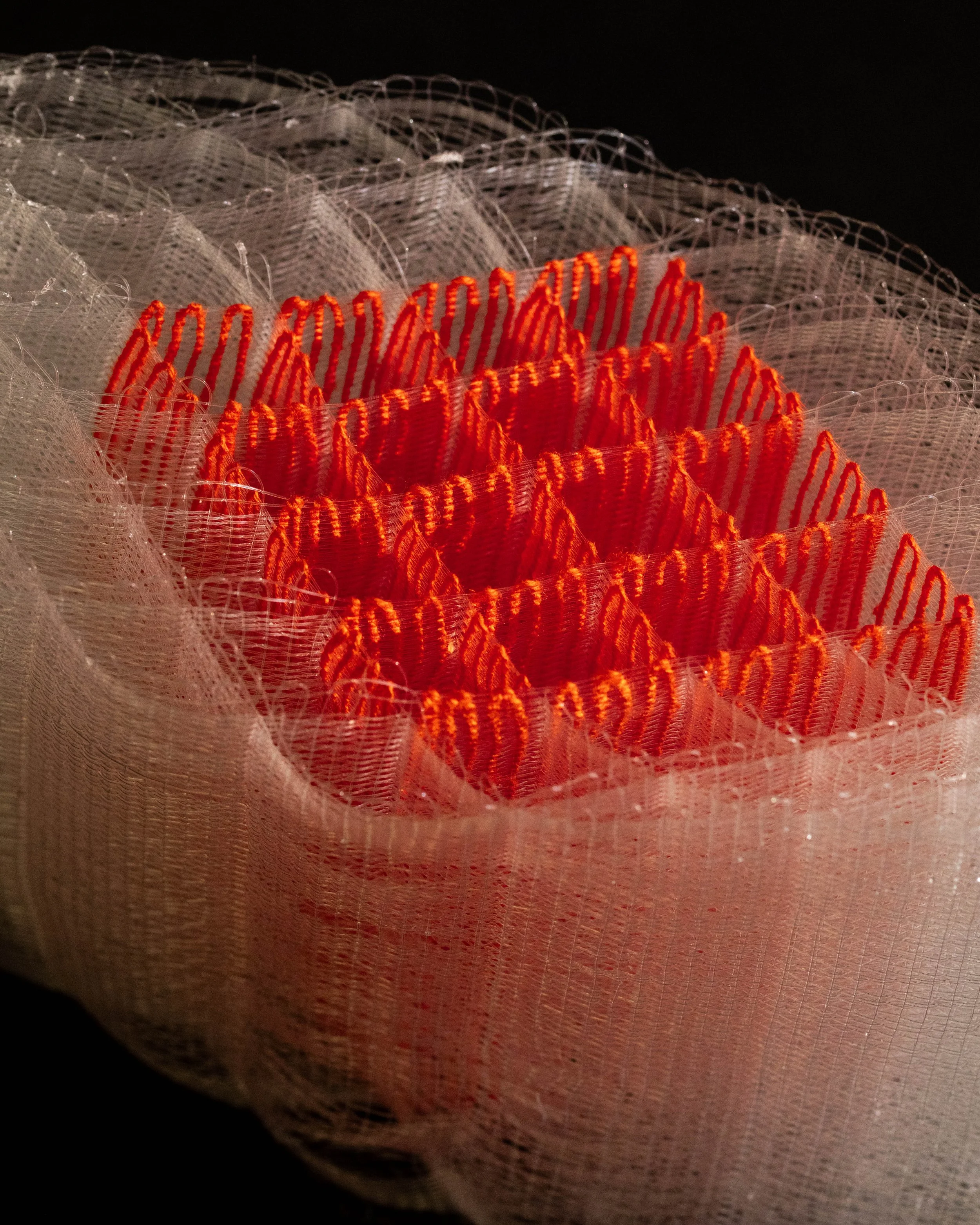 The studies investigate floating colour and layered volume. Tapestry techniques are used to create diamond shapes within the weave, while shifts in layered cloth, from single to multiple layers and back, generate triangular and circular forms. Constructed from translucent nylon monofilament and flexible TPE, with some pieces incorporating cotton/linen tapestry weft, the works explore expansion, contraction, and the emergence of space through material-led construction.