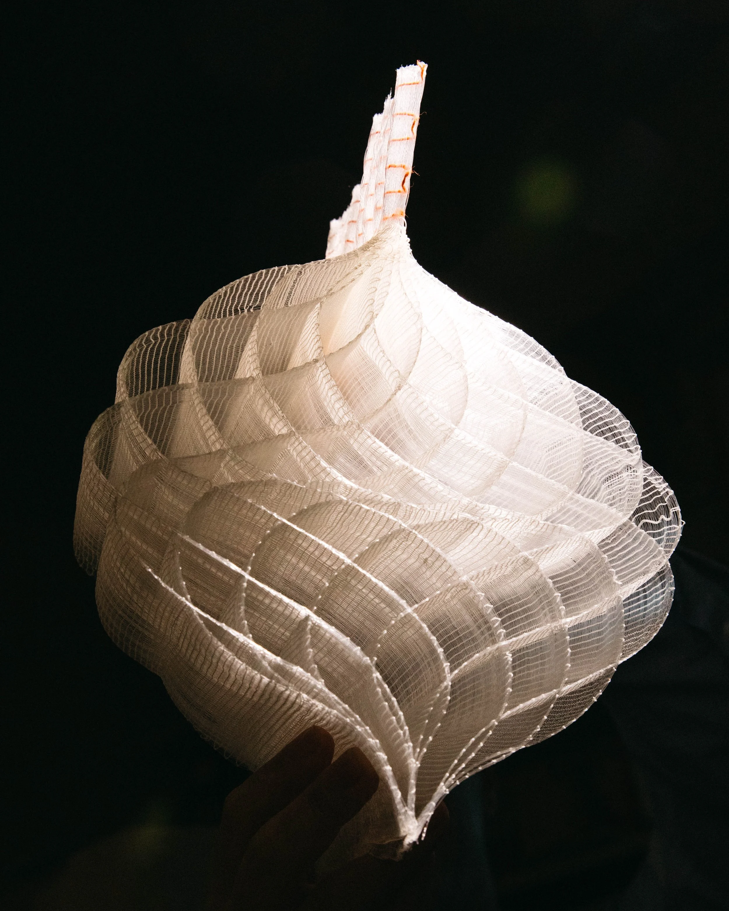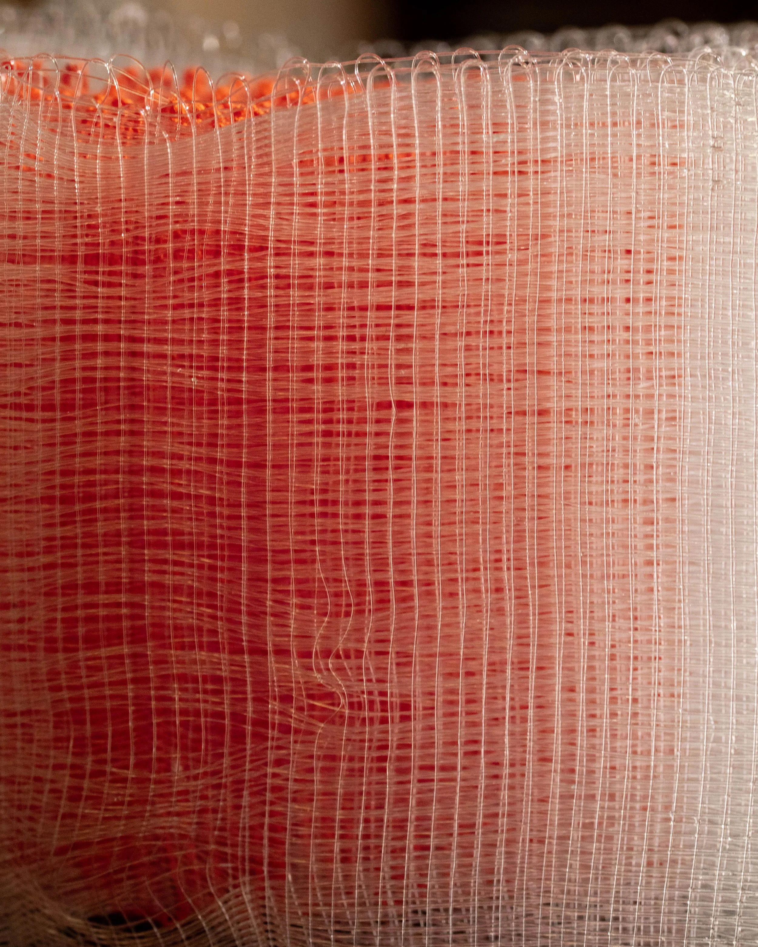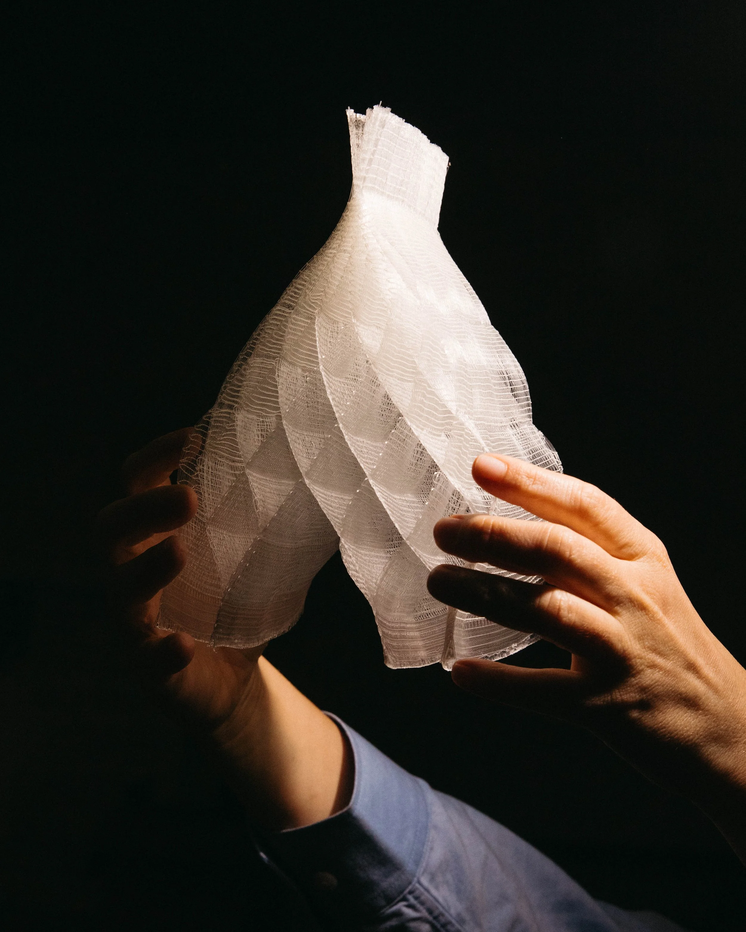 The studies investigate floating colour and layered volume. Tapestry techniques are used to create diamond shapes within the weave, while shifts in layered cloth, from single to multiple layers and back, generate triangular and circular forms. Constructed from translucent nylon monofilament and flexible TPE, with some pieces incorporating cotton/linen tapestry weft, the works explore expansion, contraction, and the emergence of space through material-led construction.