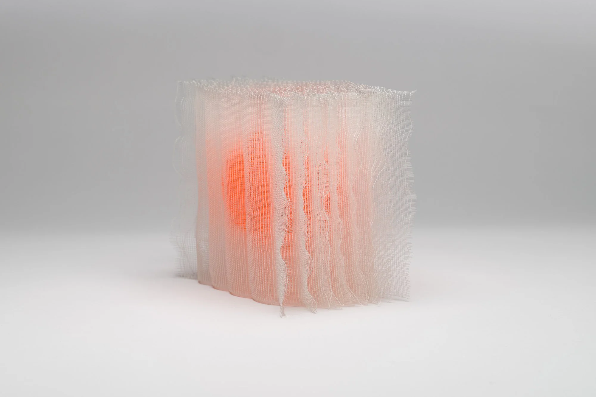 Suspension is composed of twelve interlaced layers of transparent nylon, exploring fragility and transformation through tension between structure and release. The work incorporates a three-dimensional ikat technique developed by the artist, translating a traditionally surface-based dye process into spatial form. Resist-dyed threads are mapped and woven to create an internal image that emerges as the sculpture expands after removal from the loom, revealing volume, selvedges, and shifting transparency.